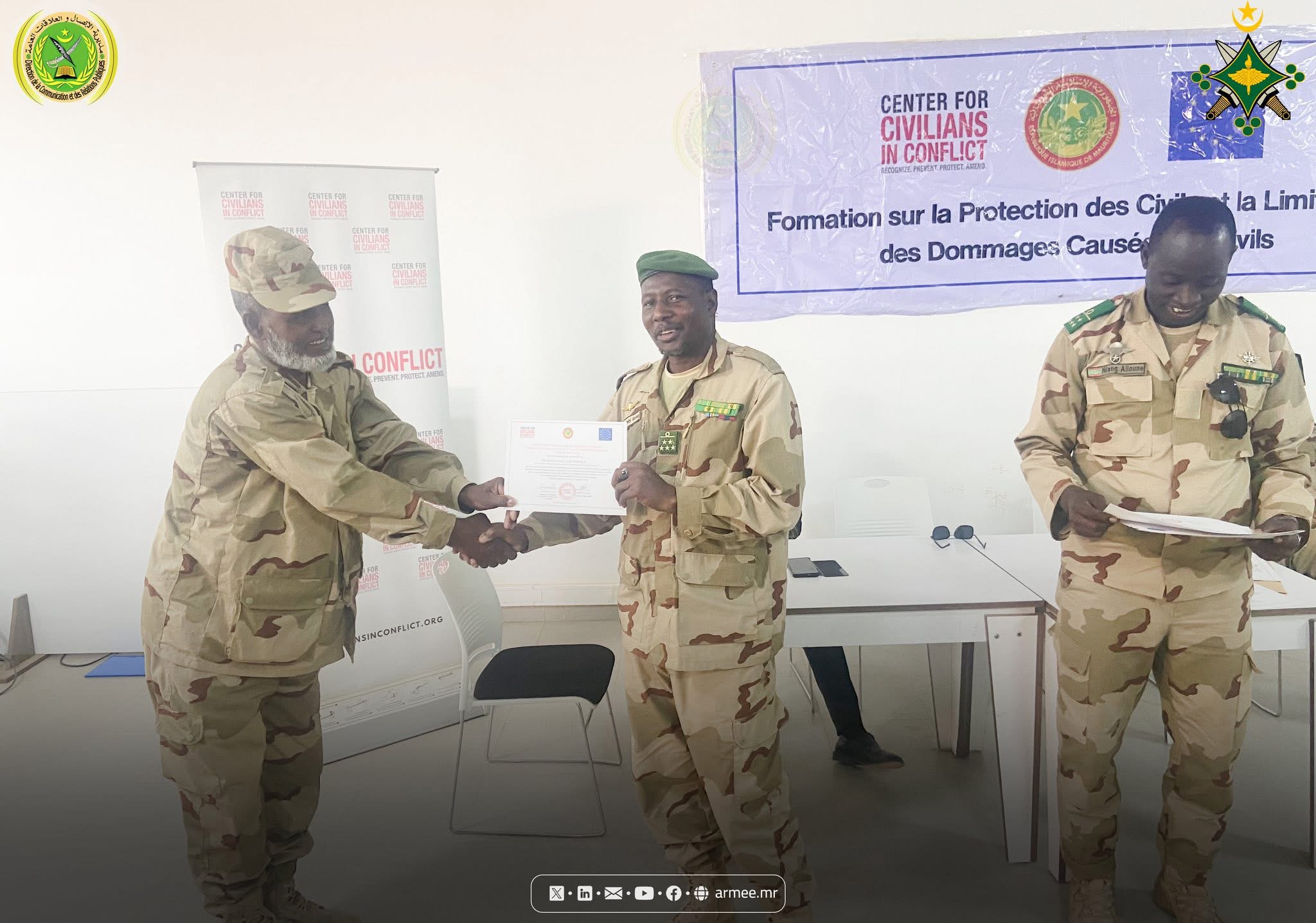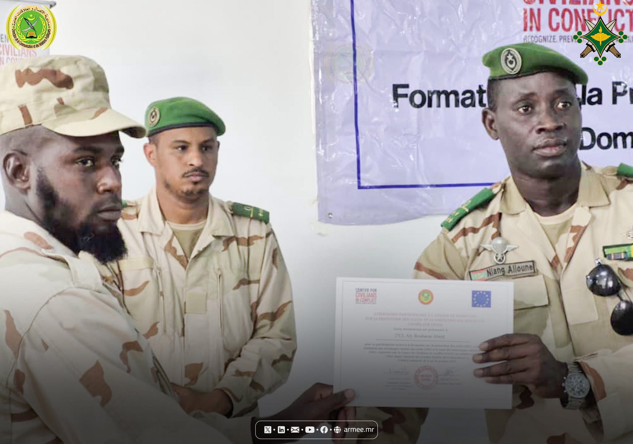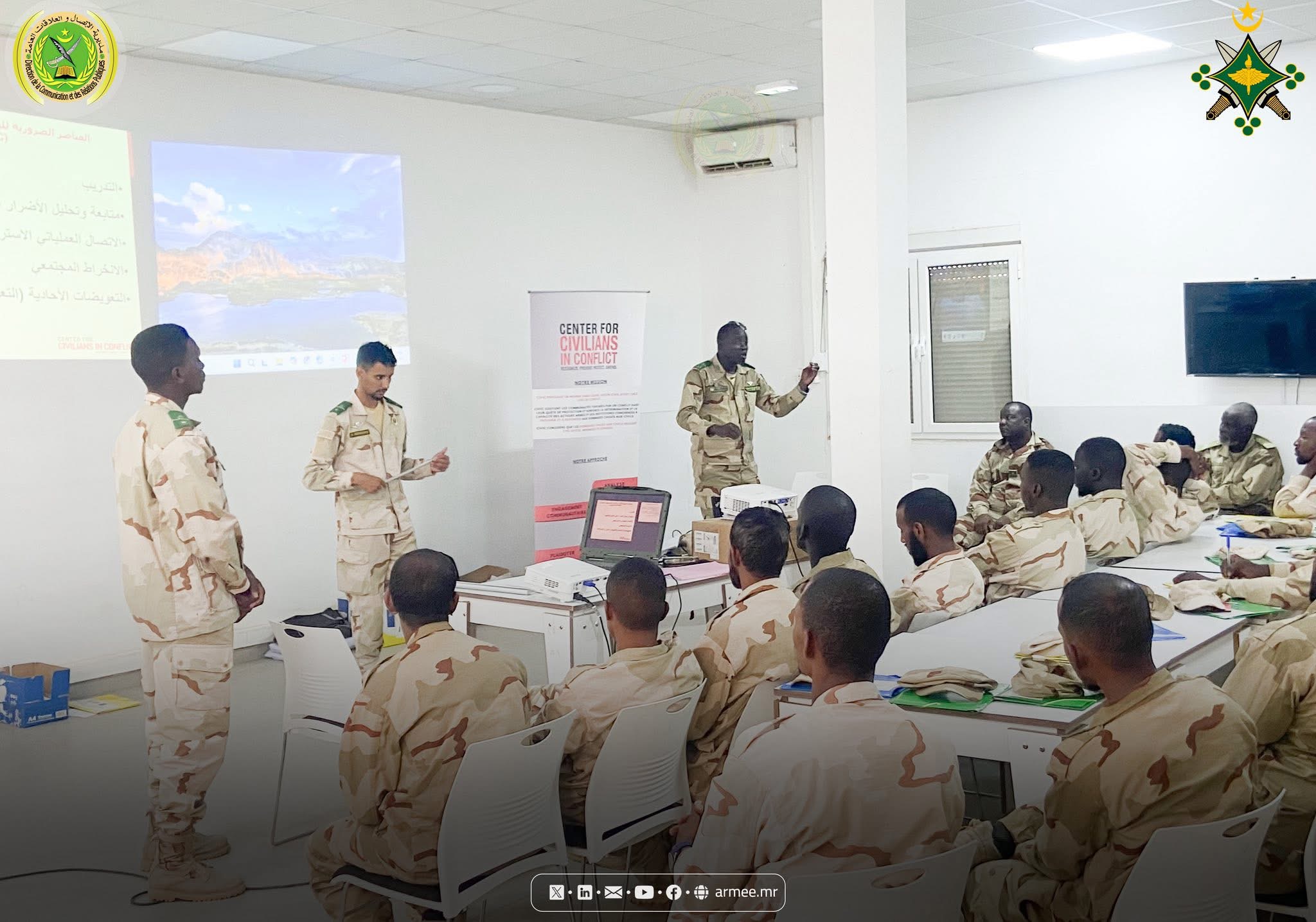 Le Colonel Abdallah Kallab, Commandant du bataillon mauritanien de la Force conjointe du G5 Sahel, a supervisé, le 17 octobre 2025, au siège du bataillon dans la commune N'Beiket Lahwach, la cérémonie de clôture d’un atelier de formation organisé par la Division des opérations de l’État-major général des armées, en collaboration avec le Centre pour la protection des civils en période de conflit (CIVIC), sous le thème : «Protection des civils et réduction des dommages causés aux civils dans les zones de conflit».