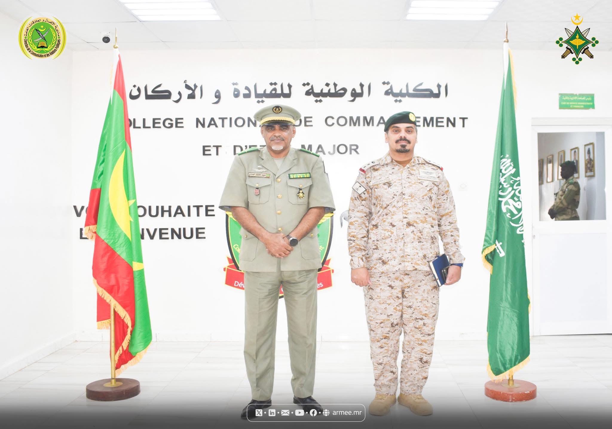 Le colonel Sidi Mohamed Ould Hamadi, commandant du Collège national de commandement et d’état-major, a reçu, dans son bureau, l’attaché de défense du Royaume d’Arabie saoudite accrédité auprès de notre pays, le colonel-aviateur d’état-major Abdelilah Ben Saleh Al-Otaibi.