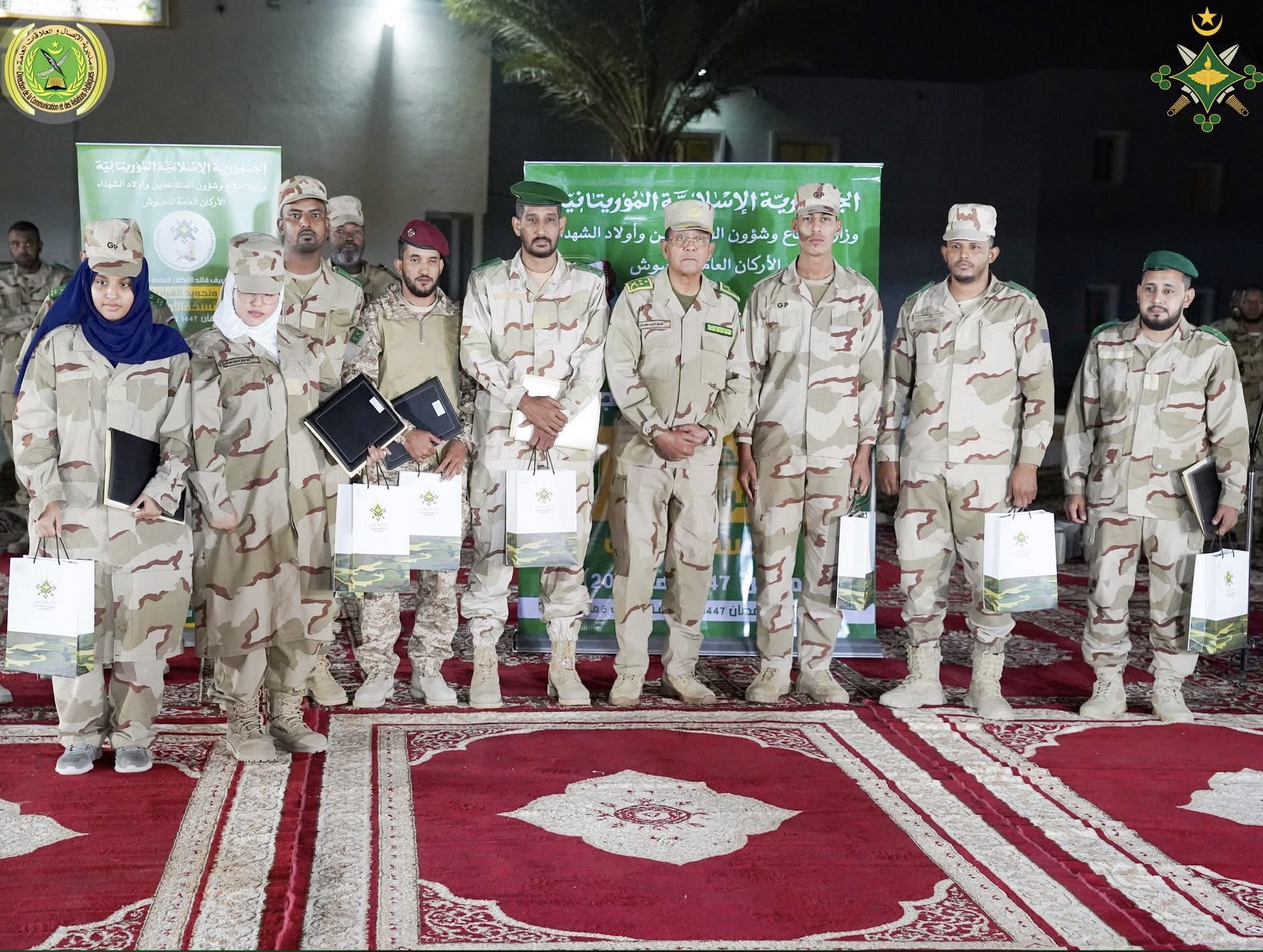 La cérémonie de clôture du concours s’est déroulée en présence du vice-amiral Ahmed Sayed Ben Aouf, Chef d’état-major de la Marine, du général de brigade Sidati Hamadi, commandant de la Division des ressources humaines, du général de brigade Mohamed El Hafez Khattari, Commandant de l’Armée de terre, du général de brigade Mohamed Lemine Blal, commandant des Forces spéciales, ainsi que de représentants du ministère de la Défense, des Affaires des retraités et des enfants de martyrs, de diverses formations, institutions, écoles et académies militaires de Nouakchott, en plus de plusieurs commandants de formations , directeurs et conseillers du Chef d’état-major général des Armées.