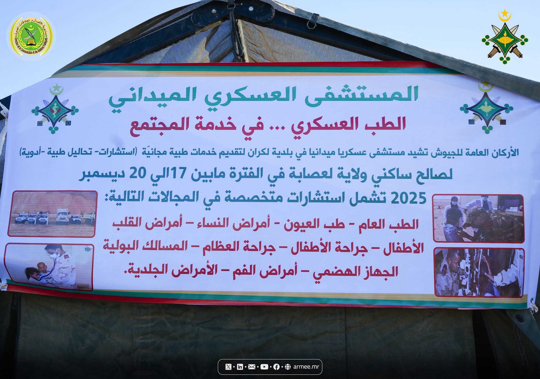 على هامش مناورة "صقر لعصابة"، وفي إطار تقريب الخدمات الأساسية من مواطني الولاية، بدأ المستشفى العسكري الميداني تقديم خدماته الطبية ببلدية "لگران" بولاية لعصابة صباح اليوم الأربعاء 17 دجمبر 2025، وسط إقبال كثيف من المواطنين الراغبين في الاستفادة من هذه الخدمات، وذلك بعد اكتمال تشييده مساء أمس الثلاثاء.