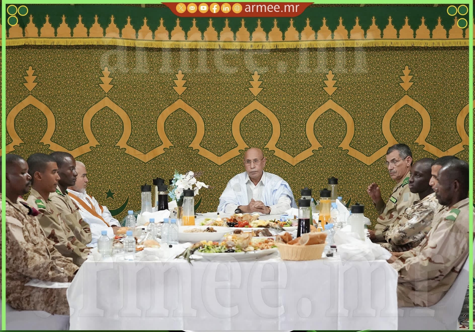 أما العقيد محمد الأمين سيد أحمد؛ قائد الأكاديمية العسكرية لمختلف الأسلحة فقد ثمن بصفته قائد حامية أطار، اختيار فخامة رئيس الجمهورية - القائد الأعلى للقوات المسلحة - حامية أطار لمشاركتها هذا الحدث الذي جسد رمزية الزمان والمكان معاً، ففي شهر تتعزز فيه قيم التضامن والوفاء - يقول العقيد - "تكرّمون حامية عريقة، لها مكانتها في تاريخ قواتنا المسلحة"، إذ يلتقي اليوم على مائدة الإفطار منتسبوا هذه الحامية كافة؛ ضباطاً وضباط صف وجنوداً وطلبة ضباط، يجمعهم شرف الخدمة وواجب الدفاع عن الوطن، مضيفا أن ذلك يحمل دلالة واضحة ورسالة بليغة تؤكد أن الدفاع عن الوطن يقوم على ركيزتين متلازمتين هما الجاهزية في الميدان والإعداد الفكري والأخلاقي المسبق. فلا تستقيم إحداهما دون الأخرى، ولا يكتمل أداء الواجب إلا بهما معاً.