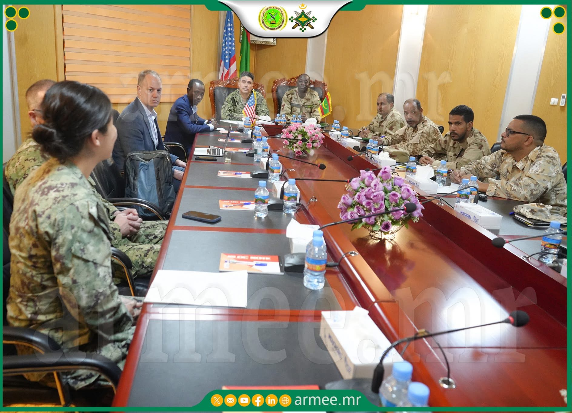 وقد عقد الوفدان الموريتاني والأمريكي سلسة اجتماعات أشرف عليها العقيد نيانگ عليون؛ قائد مكتب العمليات الخارجية بفرقة العمليات، تناولت عروضا حول تعزيز المفاهيم المشتركة للقانون الدولي الإنساني أثناء النزاعات المسلحة، والمبادئ الأساسية التي تحكم سير العمليات العسكرية، وخصوصا مبادئ التمييز، والتناسب، والضرورة العسكرية.